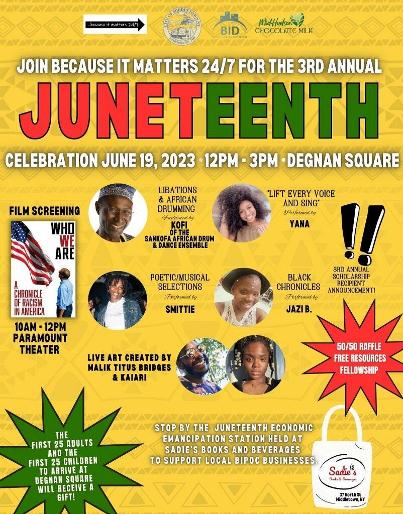 21/ June 19th, 2024 – Juneteenth Celebration with Middletown Development/Sadie’s Bookstore at Town Square, Middletown, NY from 5:00pm – 8:00pm